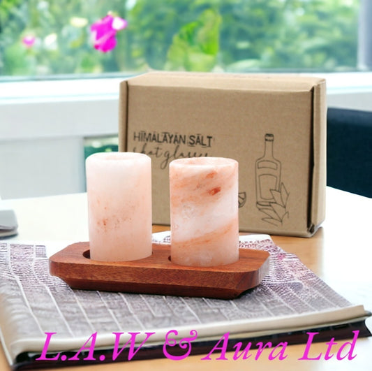Set of 2 Himalayan Salt Shot Glasses & Wood Serving Stand